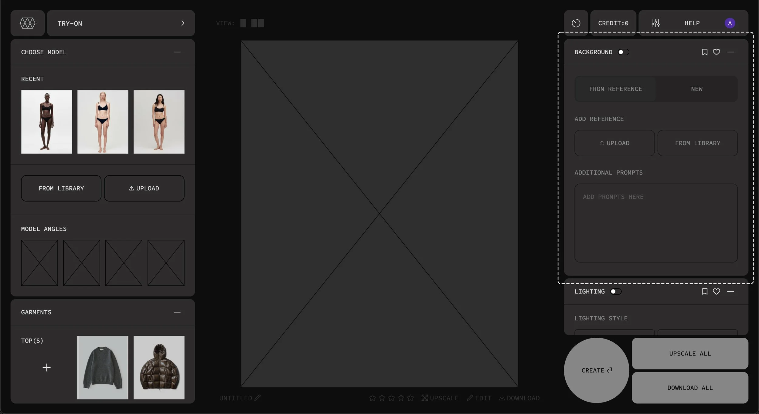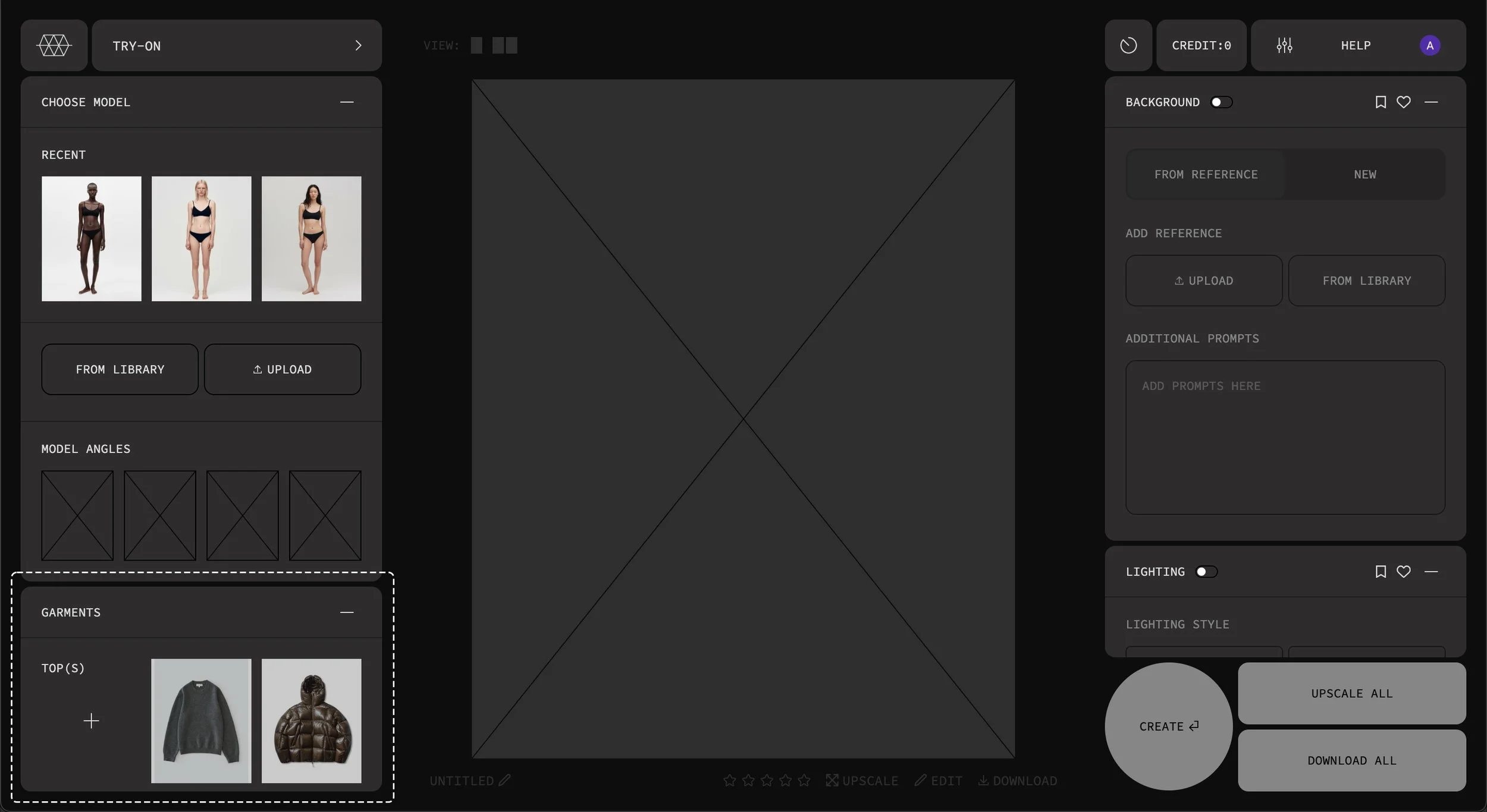 2. Select your garments. YOU CAN SELECT FROM your LIBRARY or UPLOAD YOUR OWN garments. Once you have selected a garment you have the option to add a text prompt describing how you want the garments to fit e.g regular or oversized.